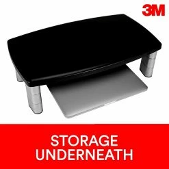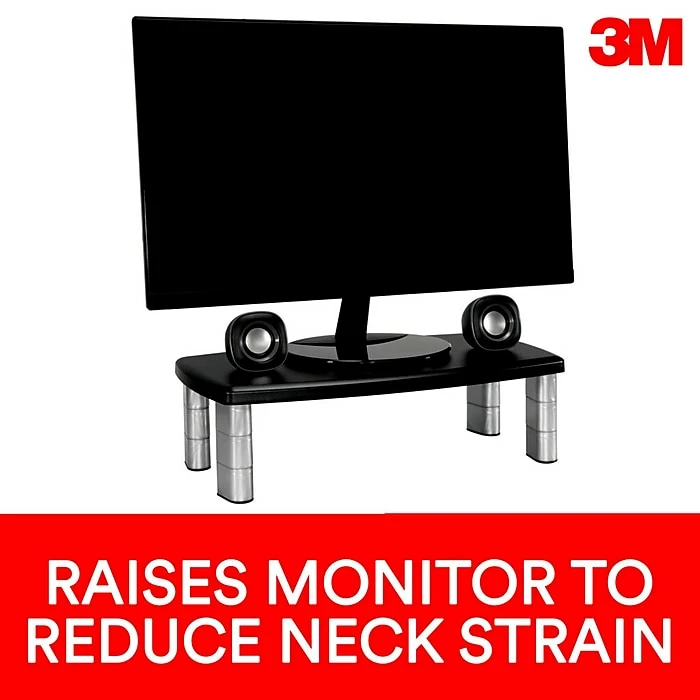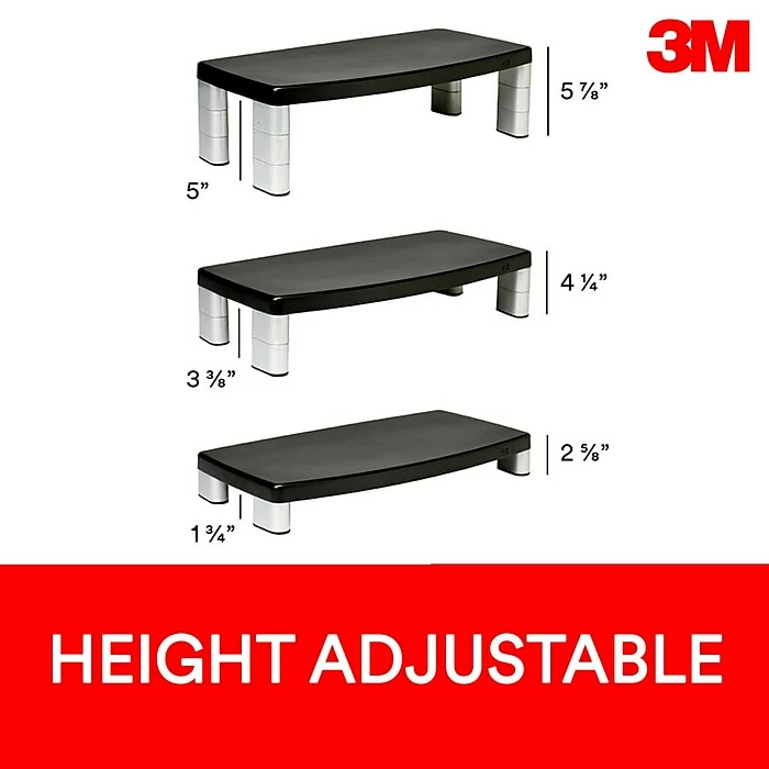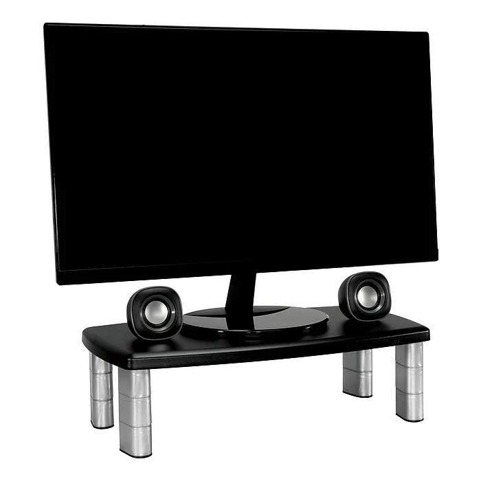 Contemporary design with stacking columns raise the monitor from 1 inch to 5 7/8 inches in increments of 1 5/8 inches to an ergonomically correct level. Features extra wide 16 inch storage space underneath to maximize desk space. Great for laptops, printers or monitors up to 40 lbs. No skid base keeps stand in place.