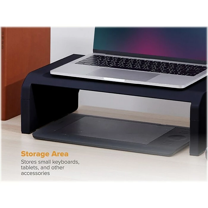 Elevate your workspace to the next level with the Bostitch Konnect monitor stand. Elevating your monitor to a comfortable eye level helps improve viewing angle and relieve eye stress. Perfect for a laptop or monitor, this stand has four adjustable height options and a bonus storage area underneath to keep small keyboards, notebooks, and other desk accessories organized. The built-in cord routing channel helps easily route any unsightly wires and cables to keep them from getting into a tangled mess on your desk. The nonslip rubber feet ensure that your monitor or laptop will stay secure on the stand.