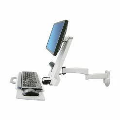 Organize your workspace with this keyboard and monitor stand. The extensible arm holds a keyboard, mouse, and a screen up to 24 inches in size, while the display allows height adjustment of up to 5 inches, so you can enjoy a better viewing angle when typing. When not in use, this Ergotron keyboard and monitor mount can be easily folded against the wall, saving space.