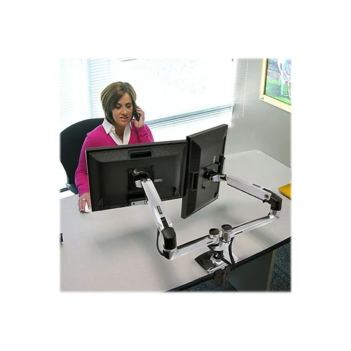 Maximize the space available on desks by using this mounting arm for flat-screen monitors. This Ergotron mounting arm lifts screens off desk surfaces and frees up space for supplies or documents to be stored.