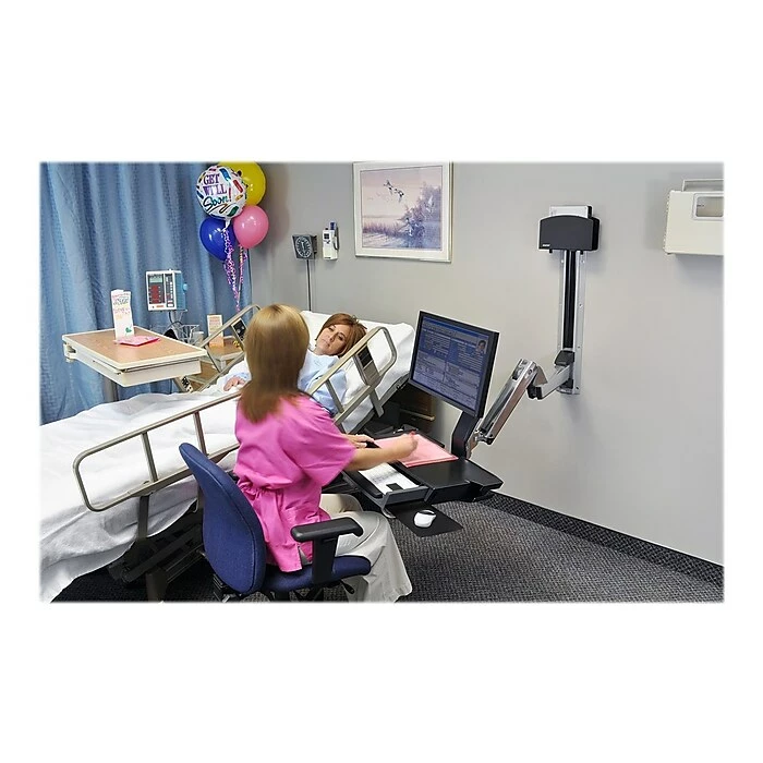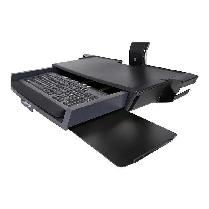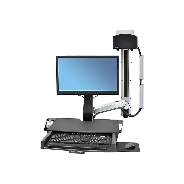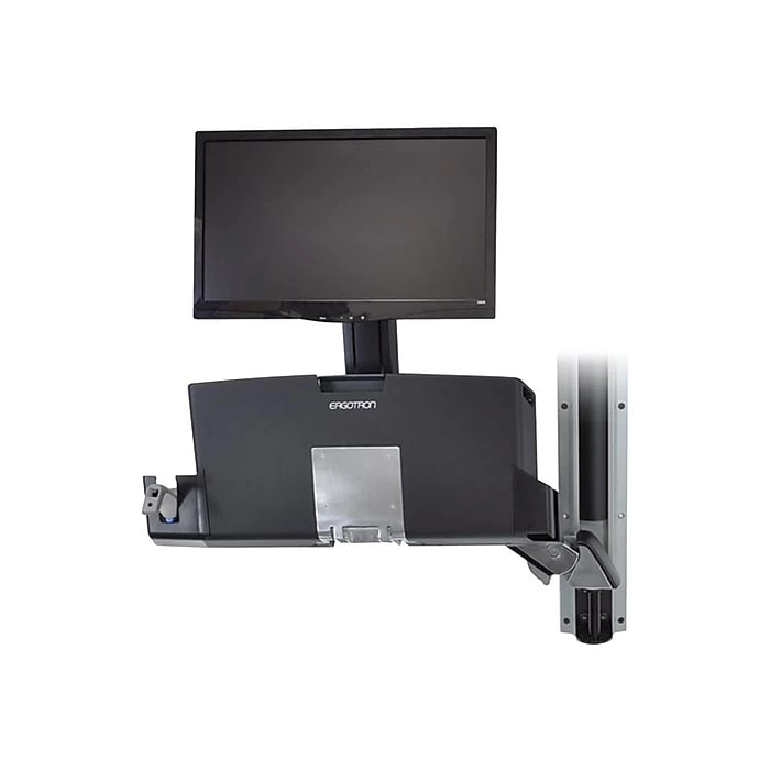 Work more efficiently using this sit-stand system. Featuring a height-adjustable and flexible arm, this mount lets you lift or lower the work surface for up to 25 inches, while the slide-out shelf provides room for your mouse, notebook or pen. When not in use, this Ergotron keyboard and monitor mount easily folds against the wall, measuring just 8 inches in depth and saving space.