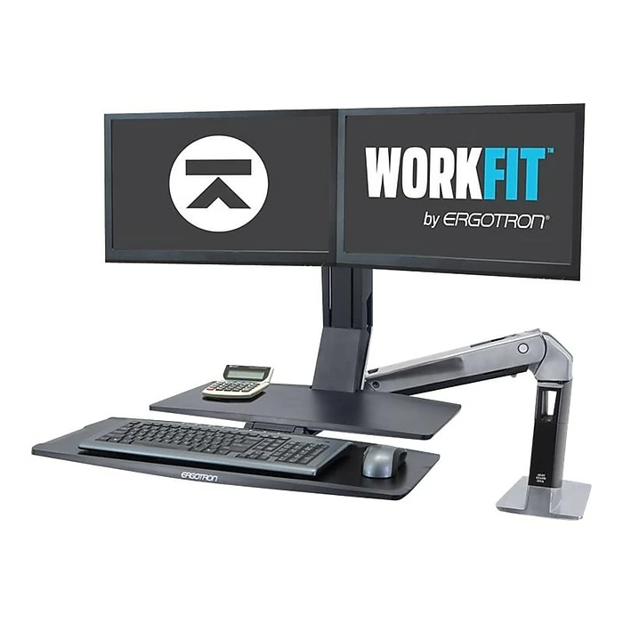 Arrange a keyboard, work surface, and two screens to create an ergonomic workstation with this dual-arm stand, which can easily lift monitors up to 20 inches off the desktop. The arms of this Ergotron WorkFit-A dual monitor stand can be used to swivel the whole workstation to either side and to keep screens out of the way when they are not in use.