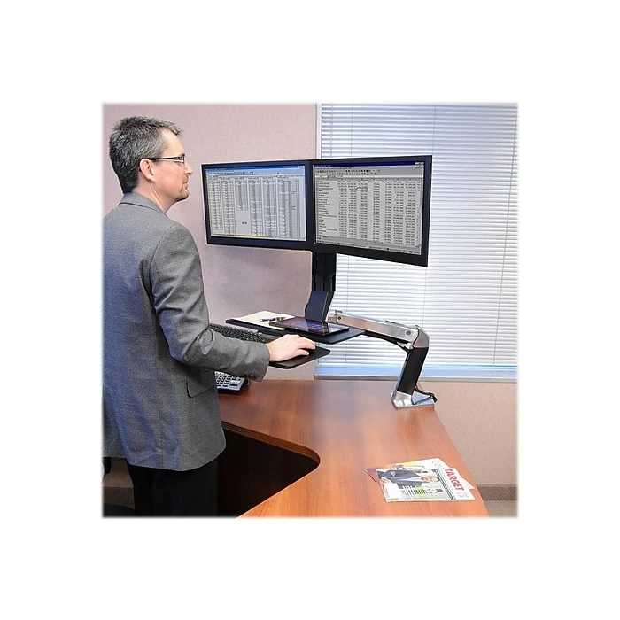 - This dual monitor stand with tray and worksurface clamps to the rear or side of most surfaces and enables an effortless sit-and-stand work style