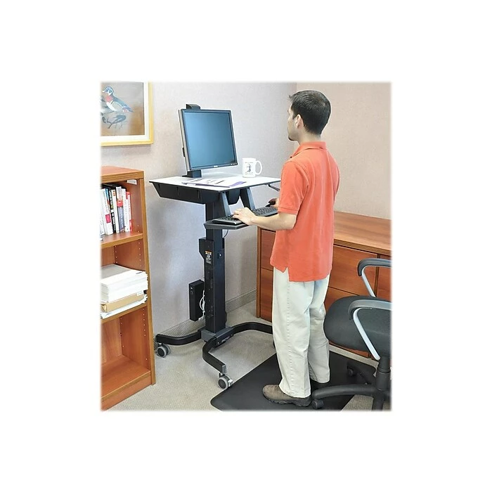 Improve the way you work by using this mobile office desk that accommodates a display up to 24 inches. Designed for maximized ergonomic comfort, this workstation has an expansive work surface, adjustable monitor riser, and back-tilt keyboard tray. Easily transport this mobile workstation with its high-quality, dual-wheel casters. This Ergotron sit-stand workstation maintains stability due to counterbalanced adjustment points.