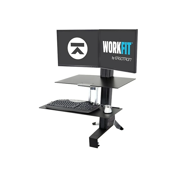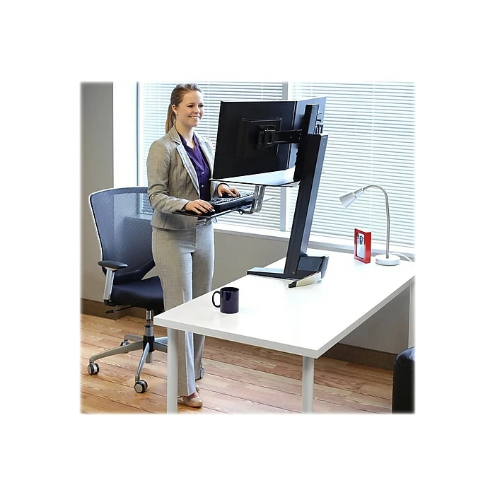 - This sit-and-stand easy-to-use dual monitor stand with a tray allows you to instantly raise or lower your keyboard and two displays in one simple motion, keeping your system stable as you work