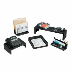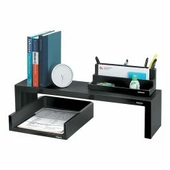 Reduce desktop clutter by using this desk shelf to hold manuals, lamps, binders and commonly used stationary supplies. This preassembled Fellowes desk shelf is ready to use and supports up to 30 pounds of materials.