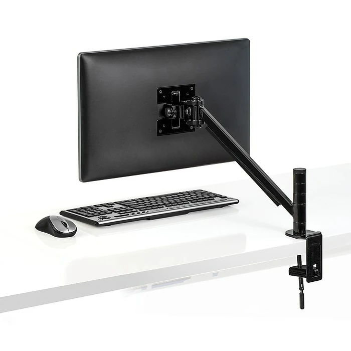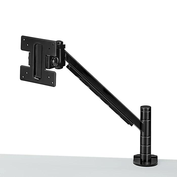 Maximize your workspace and comfort, with the easy to assemble monitor arm. This space-saving Fellowes Designer Suites Monitor Arm elevates monitors to a comfortable viewing height to prevent neck strain. It can keep monitors off crowded desktops, increasing your work area with ease. It supports 21-in. Flat panel monitors up to 20 pounds and can tilt up or down +/- 45°, pivots left to right 180°, and allows 360° screen rotation. It includes easy-to-install two-piece clamp mounts monitor between desk and cubicle wall for easy convenience.