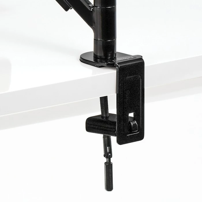 - Clamps to surfaces up to 2 ½” thick (2” desk overhang required) or mounts in grommet hole