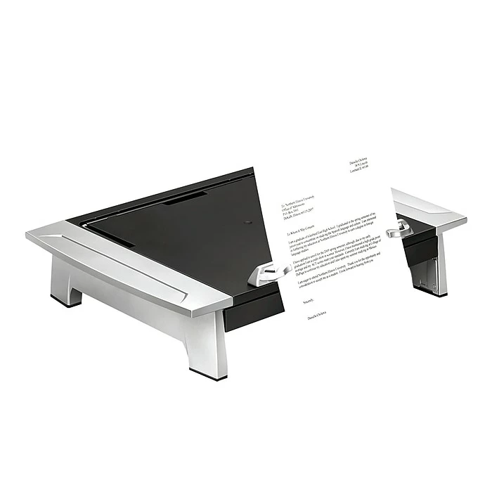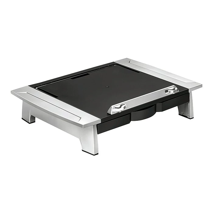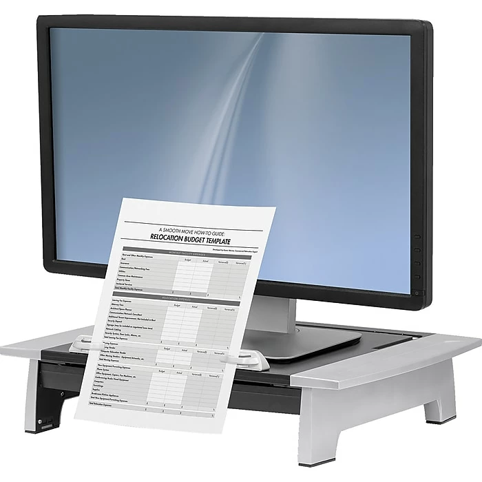 Raise a computer screen for comfort during work with this ergonomic monitor riser. An in-line document holder keeps pages in sight for fast and easy transcription, and a document storage drawer is convenient for keeping business essentials within reach. Height adjustment on this Fellowes monitor riser ranges between 4 and 6.5 inches, making it easy to match monitor height to eye level.