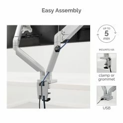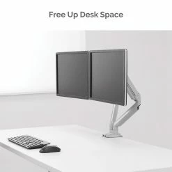 The Platinum Series Dual Monitor Arm from Fellowes elevates your view to help relieve neck and eye strain while optimizing desk space. Fully independent arms each hold up to 17.6 lbs. or 32” monitors and easily install using the Quick Fit VESA plate. The monitor arms feature gas spring technology for effortless adjustment and rotate for horizontal or vertical viewing. Easily mounts to tables or desks via clamp (between .4”-3.35” thick) or grommet (between .33”-2.75” in diameter).