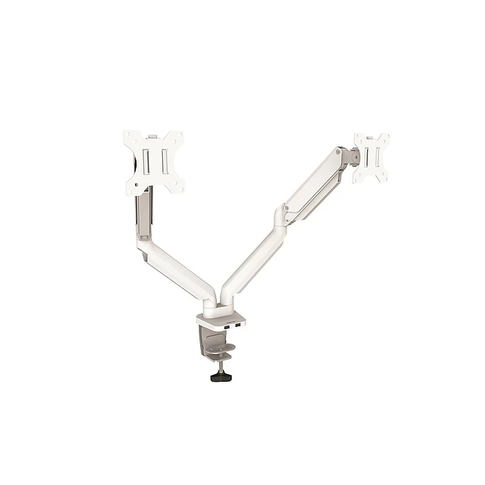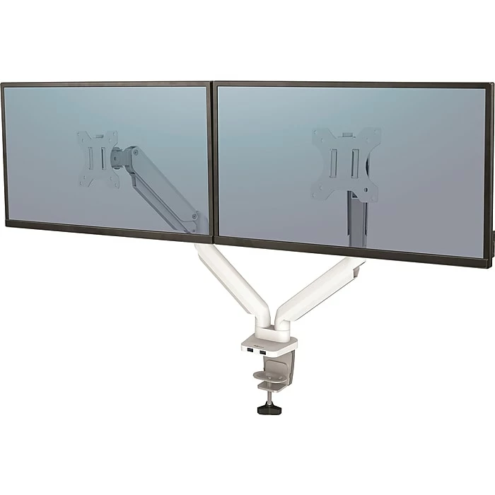 The Platinum Series Dual Monitor Arm from Fellowes elevates your view to help relieve neck and eye strain while optimizing desk space. Fully independent arms each hold up to 17.6 lbs. or 32 inches monitors and easily install using the Quick Fit VESA plate. The monitor arms feature gas spring technology for effortless adjustment and rotate for horizontal or vertical viewing. Easily mounts to tables or desks via clamp (between .4”-3.35” thick) or grommet (between .33”-2.75” in diameter).