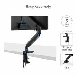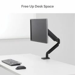 The Platinum Series Single Monitor Arm from Fellowes elevates your view to help relieve neck and eye strain while optimizing desk space. Fully independent arm holds up to 17.6 lbs. or 32” monitors and easily install using the Quick Fit VESA plate. The arm feature gas spring technology for effortless adjustment and rotate for horizontal or vertical viewing. . Easily mounts to tables or desks via clamp (between .4”-3.35” thick) or grommet (between .33”-2.75” in diameter).