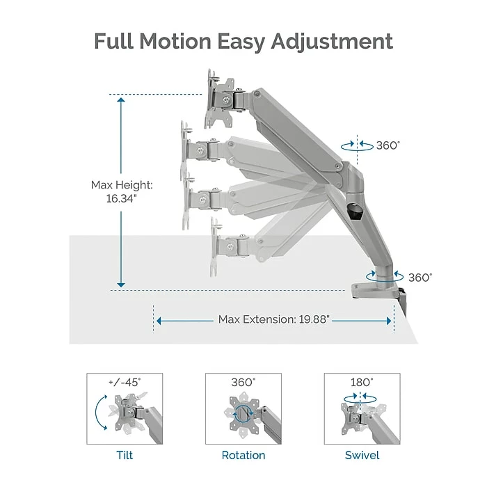 - Fully independent adjustable arm: increase workspace flexibility with 19.75 inches reach and free up desk space