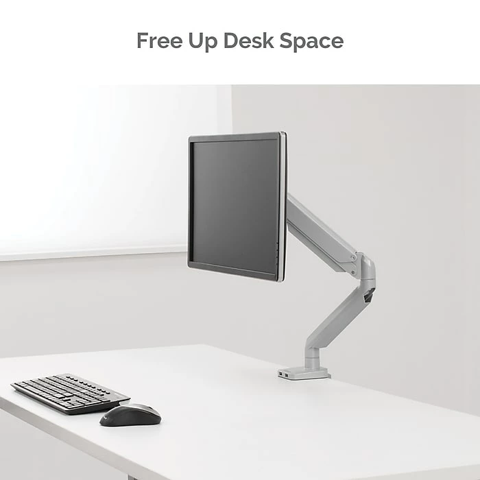 The Platinum Series Single Monitor Arm from Fellowes elevates your view to help relieve neck and eye strain while optimizing desk space. Fully independent arm holds up to 17.6 lbs. or 32 inches monitor and easily install using the Quick Fit VESA plate. The arm feature gas spring technology for effortless adjustment and rotate for horizontal or vertical viewing. Easily mounts to tables or desks via clamp (between .4”-3.35” thick) or grommet (between .33”-2.75” in diameter).