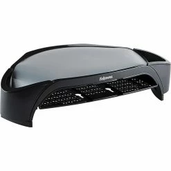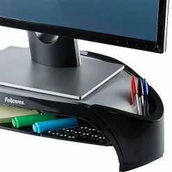 The three height adjustments of the Smart Suites Plus monitor riser maximize your viewing comfort. This riser includes a letter tray and two accessory pods for additional storage space. You can also stow a laptop or documents below the top surface to keep your desk clutter-free.
