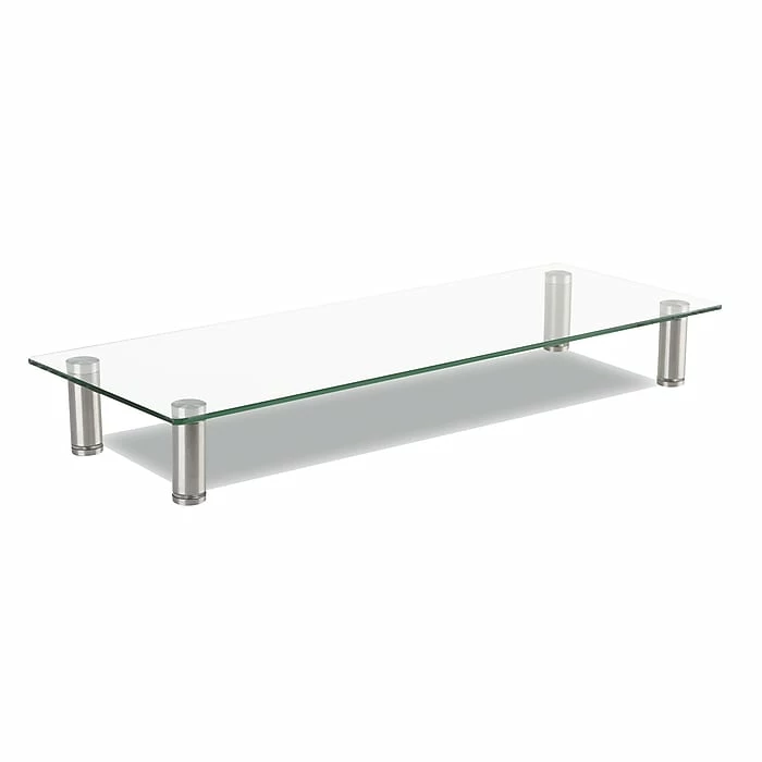 Elevate your monitor to a proper eye position with this sleek looking tempered glass monitor riser. Adjustable stainless steel feet allow the user to rise or lower their monitor riser easily and provides increased storage room beneath the desktop. Supports up to 44 lb. and screen sizes of 13″-22″.
