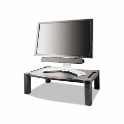 Improve the viewing angle of most monitors with this adjustable stand. The wide base also supports heavier devices including printers and fax machines, and additional storage area underneath the base improves overall desktop organization. Additional fixtures on this Kantek stand help manage video connections or cables that power the monitor and a variety of other devices.