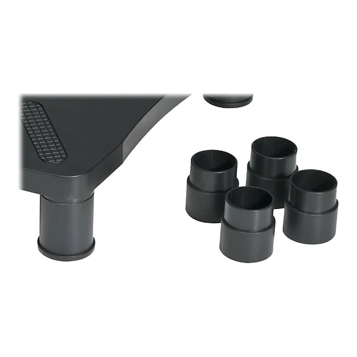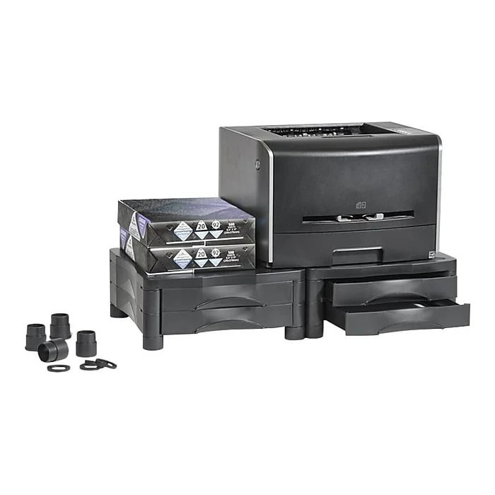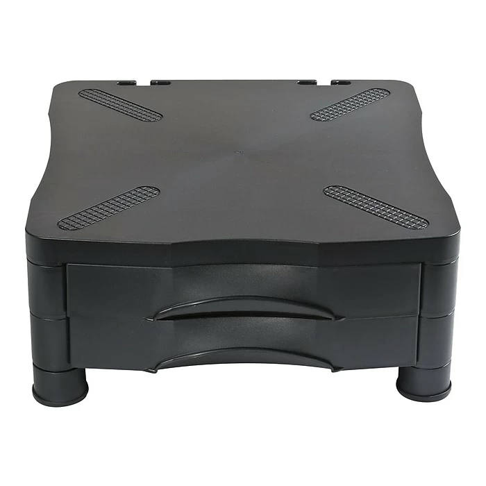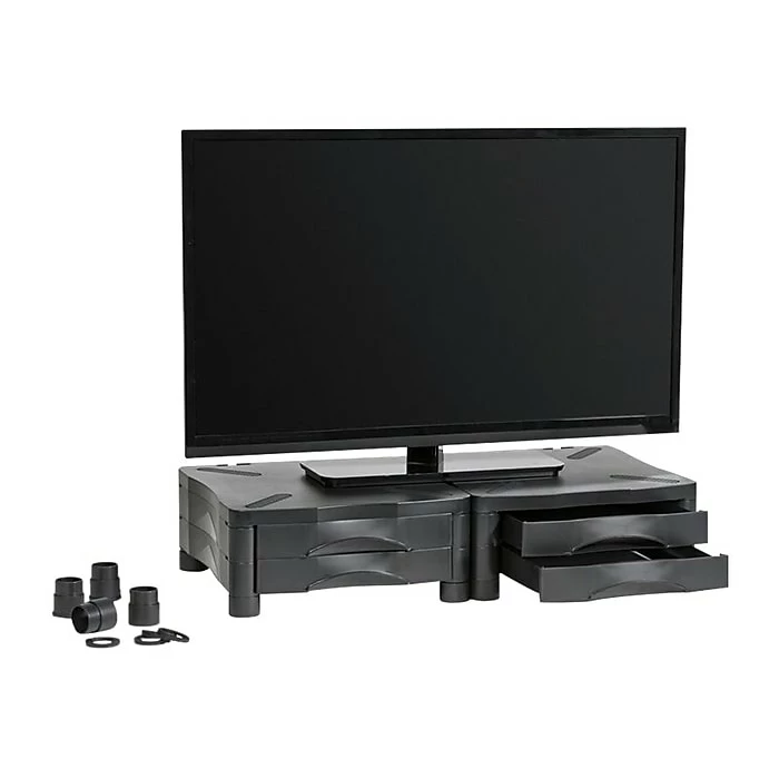 Raise your display for an improved viewing position with this monitor riser. Included insert tubes allow for 1-inch height adjustment, while the dual cable management system hides cords for an orderly look. The high-impact plastic construction supports 60 pounds, and the nonskid foot rings reduce movement. Each drawer on this KellyREST display stand holds 150 papers for easy organization.