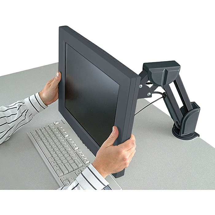 - Save space by suspending zero-footprint flat panel monitor above desk