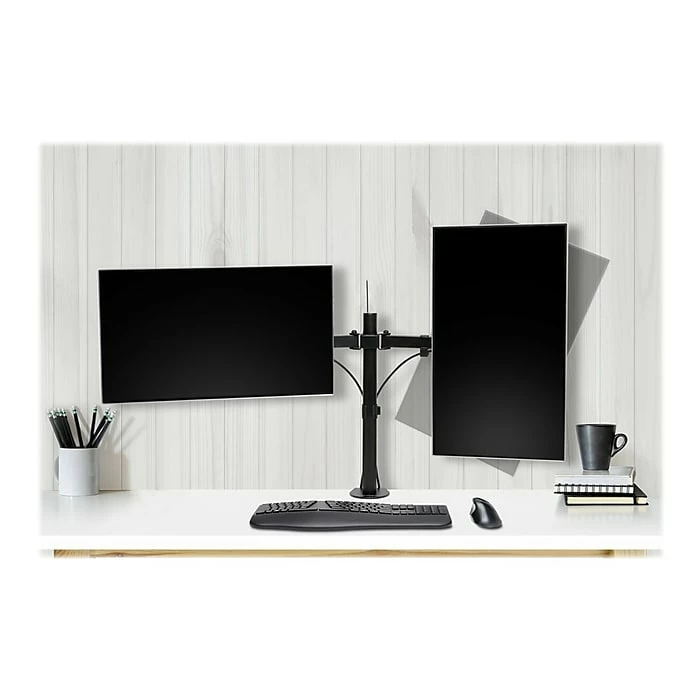 - Raise your monitors to a comfortable viewing height with this dual monitor arm