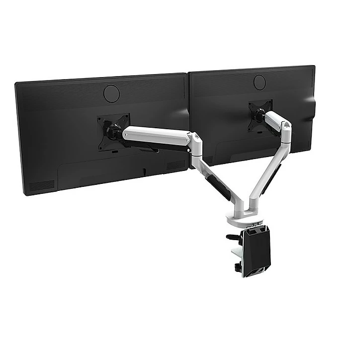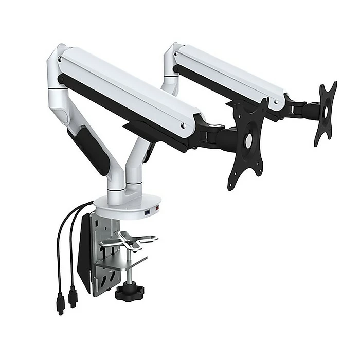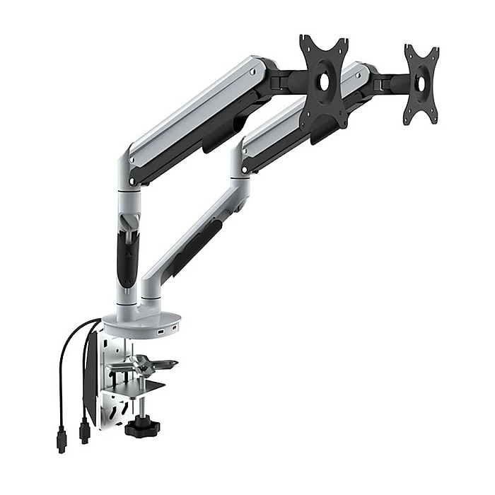 The Loctek Q7D dual arm computer monitor desk mount is height adjustable and can swivel and tilt to help position your monitors at the ideal position. Simple, yet elegant, this monitor mount will provide an ergonomic solution that is perfect for anyone who wants to easily adjust their viewing angle to an ergonomic level to help reduce neck, back and eye strain while opening up valuable desktop space. Holds up to two monitors weighing up to 19.8 lbs. each.