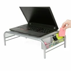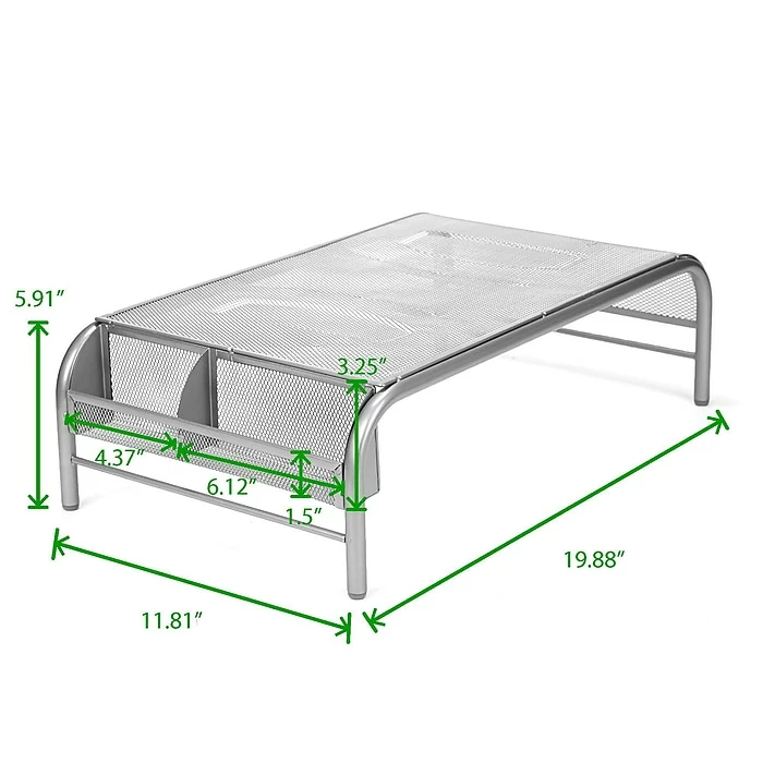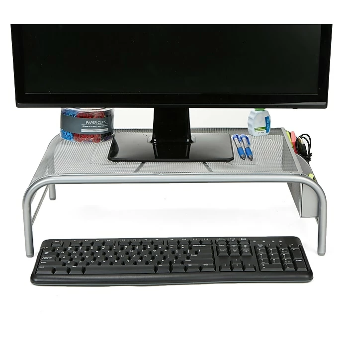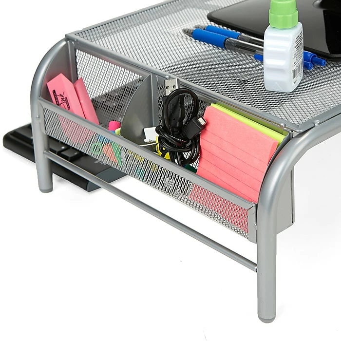 Keep your monitor or laptop at your level for an easier view to reduce neck and eye straining. The metal mesh material allows for great stability and durability. It even has compartments on the side to put stationery items.