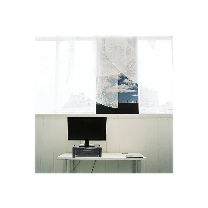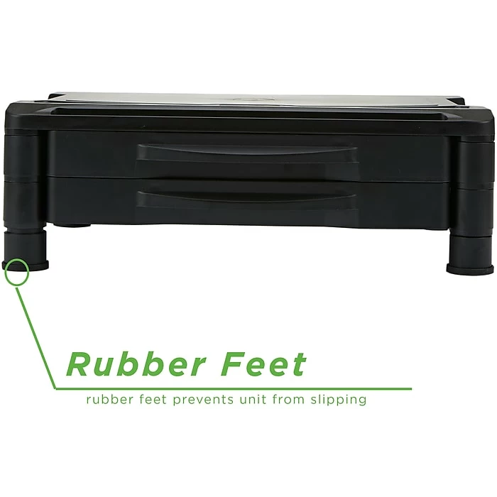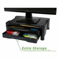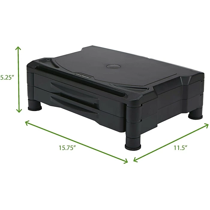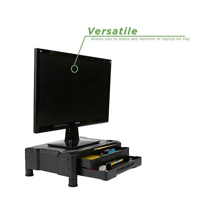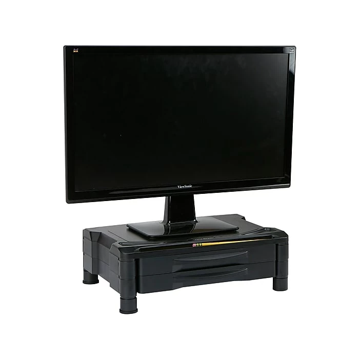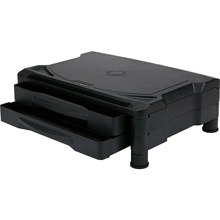 Reams of paper lifting your monitor up? With a cool modern design, the Mind Reader monitor stand raises your monitor for maximum comfort, reducing eye and neck strain. The two drawers help organize pens, pencils, notes, and desk supplies.