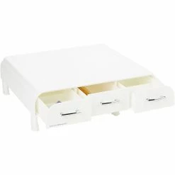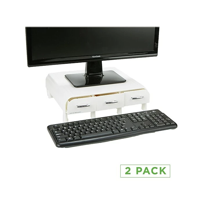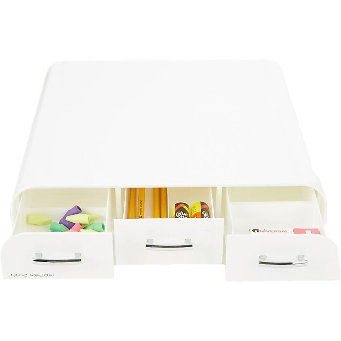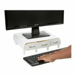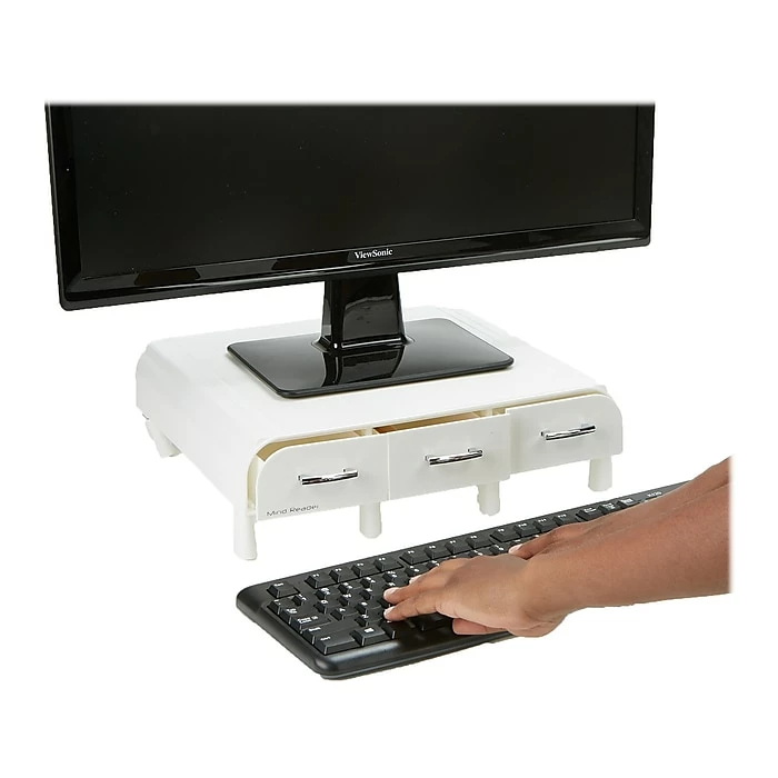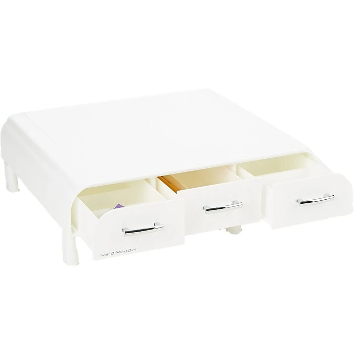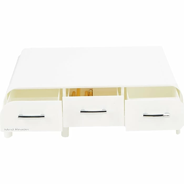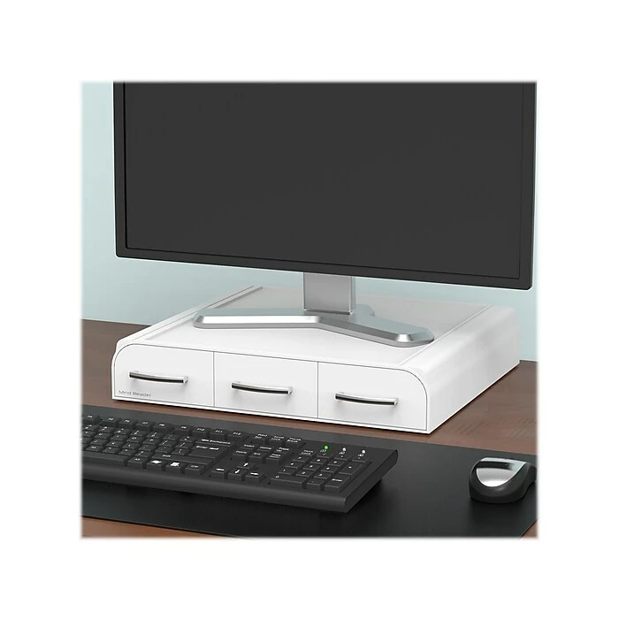 Raise your monitor to a comfortable viewing height with this monitor stand. Mind Reader Monitor Stand features three drawers for paper clips, thumbtacks, and other small desk supplies. It is easy to clean by simply wiping with a soft damp cloth. Strong plastic construction will last for years.