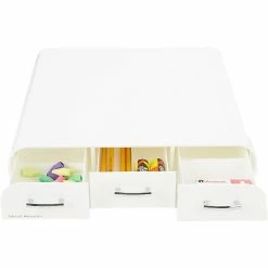 - Features three drawers for paper clips, thumbtacks, and other small desk supplies