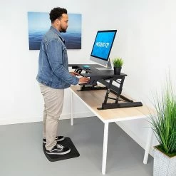 This bundle includes a height adjustable manual sit stand desk converter large enough for two monitors and a soft anti-fatigue mat for more comfort and less pain while standing at work. The Active Essentials Plus ergonomic bundle can easily and quickly turn any existing workspace into a healthier, more active workstation and is perfect for those looking to create a more comfortable and ergonomic work environment. Maintain a healthy balance of sitting and standing throughout the day to increase productivity, boost energy and improve your workflow. Start on the path to a healthier way to work with this ergonomic workstation bundle. The manual height adjustable standing desk converter features a wide 36” tabletop and can adjust from 6.25” to 16.5” high, allowing you to create a customized setup throughout the day. Our anti-fatigue mat is a necessity with any standing desk. The soft cushy floor mat allows you to stand longer at your standing desk without the pain associated with prolonged periods of standing.