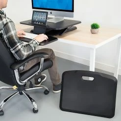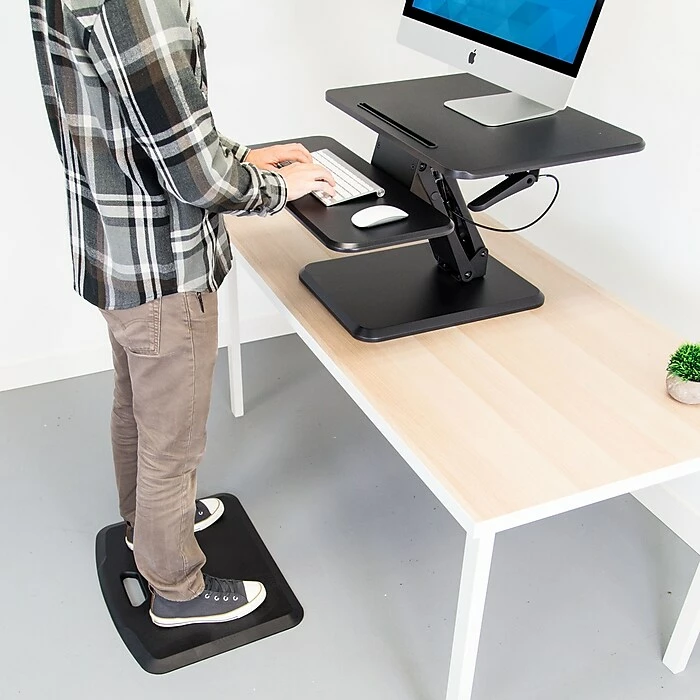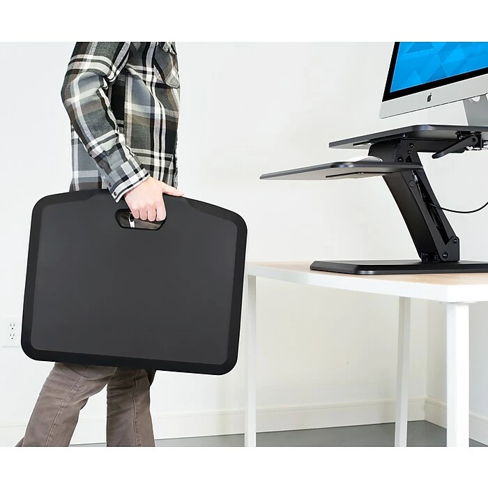 This bundle includes a height adjustable manual sit stand desk converter, which comes preassembled and a soft anti-fatigue mat for more comfort and less pain while standing at work. This combination can quickly turn any existing workspace into a healthier, more active workstation and is perfect for those looking to create a more comfortable and ergonomic work environment. Incorporate the Active Essentials ergonomic bundle into your everyday work life and start enjoying the benefits! Sit and stand throughout your day for a healthier, more active way to work. This increases energy, boosts productivity and reduces or eliminates aches and pains associated with prolonged sitting. The preassembled standing desk converter comes preassembled and can be placed on any tabletop to turn your existing space into a sit stand workstation. It is manually powered and features a height adjustment range from 6.1” to 19.5”. Our anti-fatigue mat is a necessity with any standing desk. The soft cushy floor mat allows you to stand longer at your standing desk without the pain associated with prolonged periods of standing.