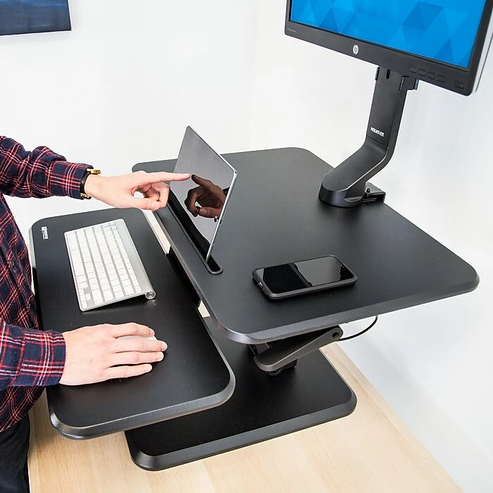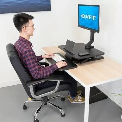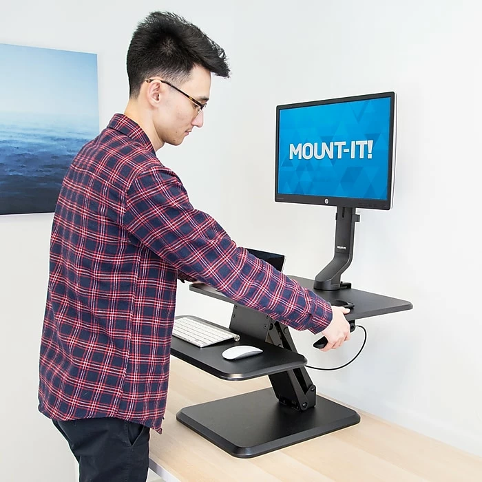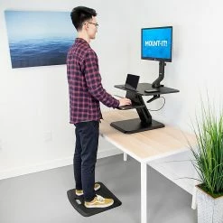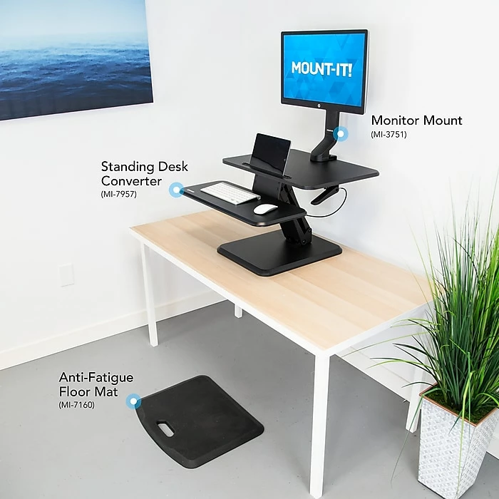 Create an ergonomic workspace unlike any other with this ergonomic bundle from Mount-It!. It features a manual height adjustable sit stand desk converter, single monitor mount and an anti-fatigue mat, all designed to reenergize your workspace for a healthier, and better way to work. The single monitor mount has a height adjustable VESA head and a low-profile base, designed so that the desk converter can sit in its lowest position without hitting the table below. These features, combined with the anti-fatigue mat are sure to improve the way you work.The preassembled standing desk converter comes preassembled and can be placed on any tabletop to turn your existing space into a sit stand workstation. It is manually powered and features a height adjustment range from 6.1” to 19.5”.The single monitor mount included in this bundle is designed specifically for sit stand desk converters. Its low-profile base allows the desk converter to lower to its lowest position without the c-clamp hitting the desk it’s sitting on. Our anti-fatigue mat is a necessity with any standing desk. The soft cushy floor mat allows you to stand longer at your standing desk without the pain associated with prolonged periods of standing.