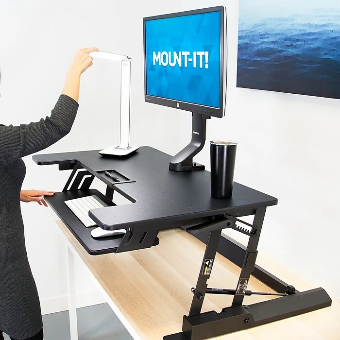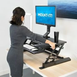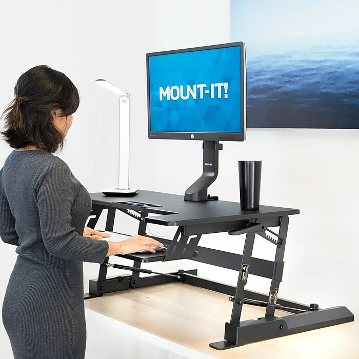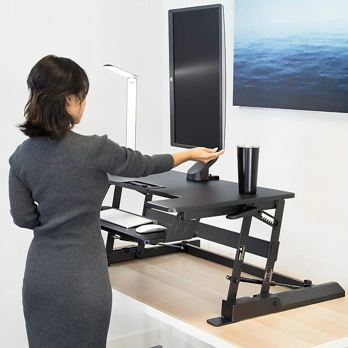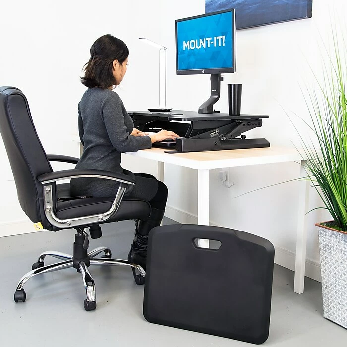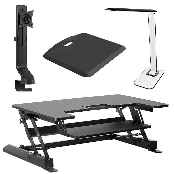 Place this pre-assembled desk converter on your existing desk to start immediately enjoying the benefits of a standing desk. Paired with our single monitor mount for standing desk converters, anti-fatigue floor mat and LED desk lamp, this workstation bundle was created to drastically improve your workspace. Improve your health and wellness, while maximizing efficiency and workflow with this ergonomic workspace upgrade. The manual height adjustable standing desk converter features a wide 36” tabletop and can adjust from 6.25” to 16.5” high, allowing you to create a customized setup throughout the day. The single monitor mount included in this bundle is designed specifically for sit stand desk converters. Its low-profile base allows the desk converter to lower to its lowest position without the c-clamp hitting the desk it’s sitting on. Our anti-fatigue mat is a necessity with any standing desk. The soft cushy floor mat is designed to allow you to stand longer at your standing desk without the pain associated with prolonged periods of standing. Our Relaxalight LED Desk Lamp features 7 levels of brightness control, temperature color settings and includes a USB port to charger your devices.