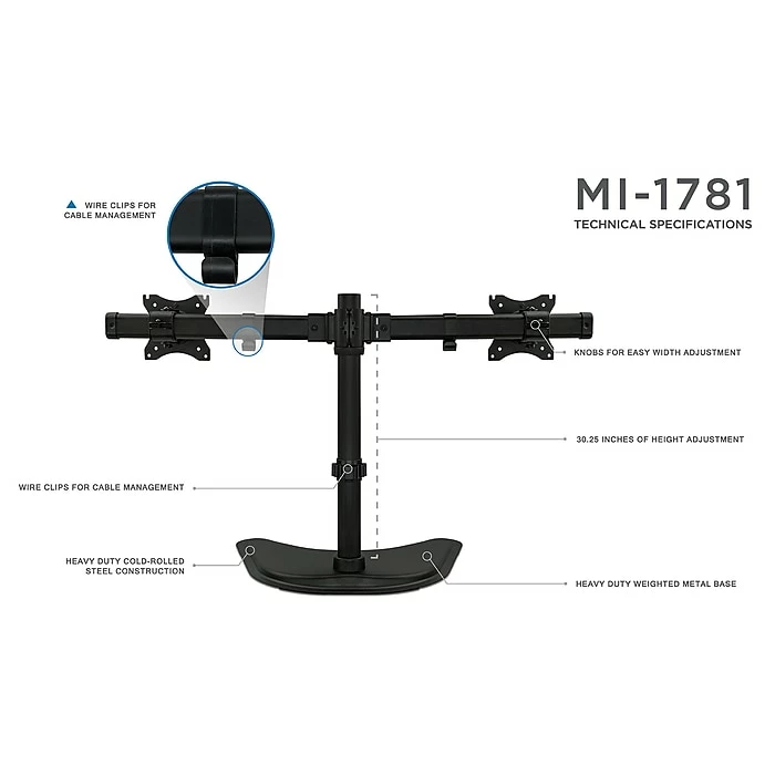 - Load Capacity: 22 lbs. per monitor (44lbs total)