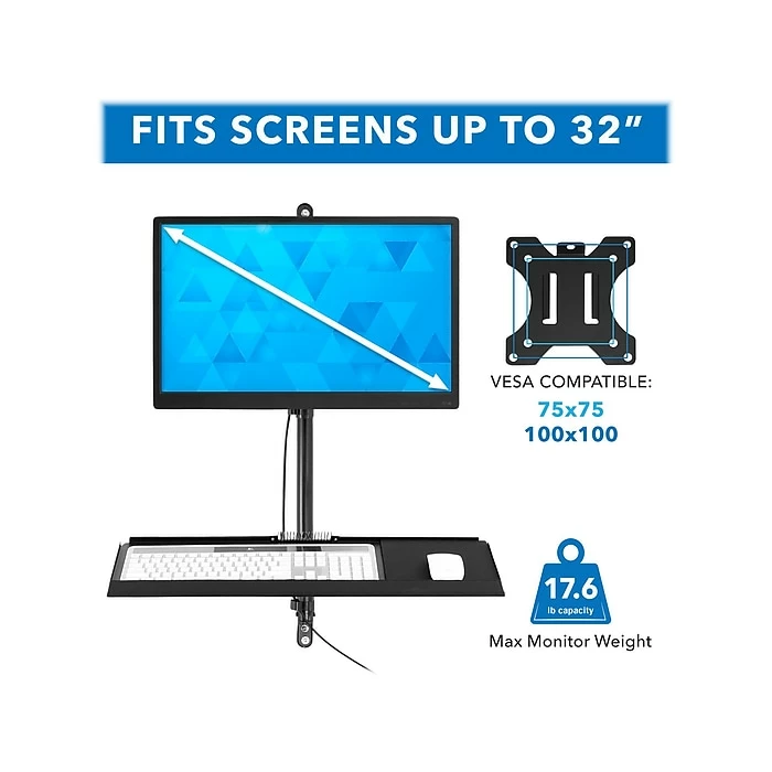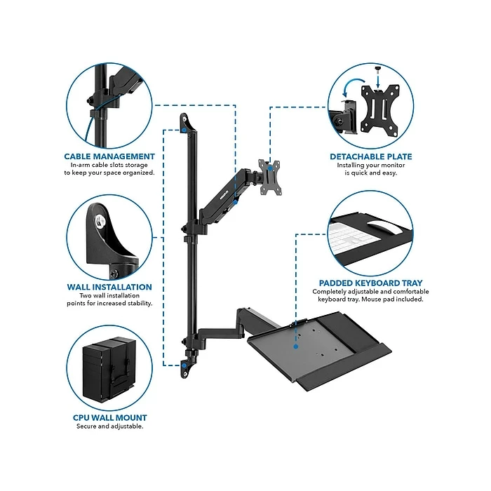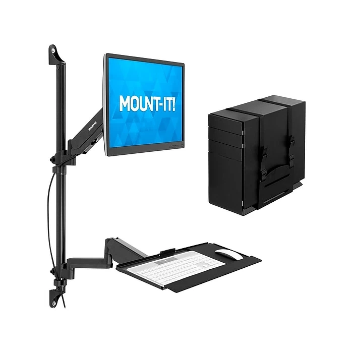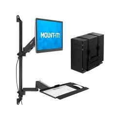 This Mount-It! wall-mount workstation is designed for commercial and industrial use. It houses one monitor, keyboard, and mouse tray, as well as a desktop computer CPU in a compact and ergonomic package. The gas-spring monitor and keyboard tray arms offer full motion and height adjustment. It is perfect for applications where more than one user needs access to the computer system. The wall-mounted design takes up minimal space and can be adjusted for the needs of multiple users.