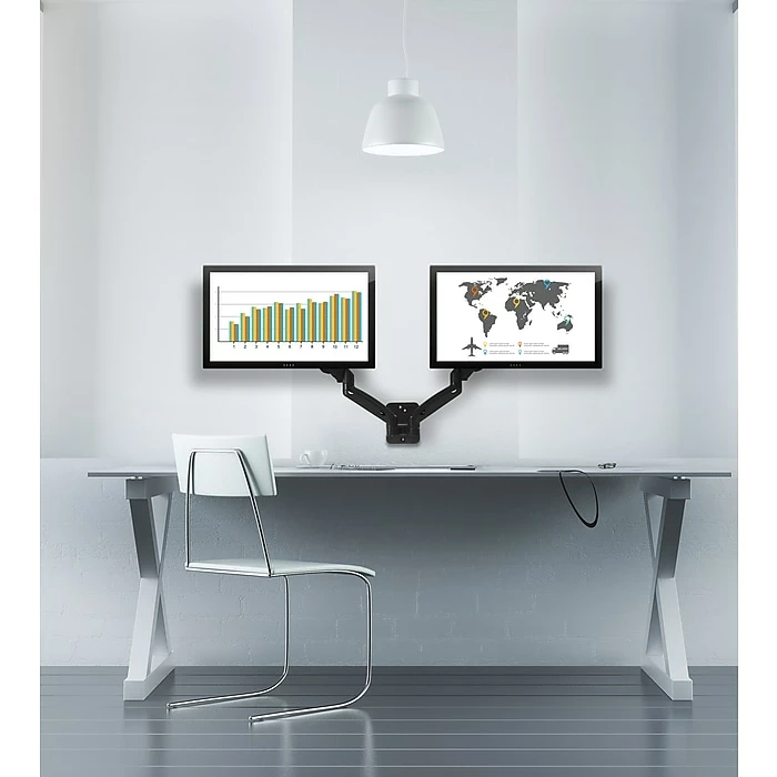 Mount-It! dual arm monitor wall mount helps clear out your desktop space and raise two monitors for a more ergonomic installation. Raising monitors to eye level helps prevent common issues such as neck and back pain and eye strain. Dual monitors increase productivity by displaying more information and applications right in front of your eyes. However, dual monitors take up space and if not installed correctly, will require you to switch positions when viewing different screens. Mount-It! monitor wall mount allows two monitors to be installed side by side while utilizing wall space. With the 180 degree rotation, you can switch one of the monitors to portrait mode, while the other in landscape mode. Or, if you are a gamer, you can angle the monitors towards each other to create an immersive view. We utilized the best gas spring components available in the market to make the height adjustment fluid and easy. The tension on the gas spring can be increased or decreased to the adjust the amount of counterbalance for the weight of your monitors – allowing fingertip height adjustment. Dual arm full motion design allows screens to tilt up and down, swivel left and right, as well as the ability to push the monitors towards the wall or extend them away from the wall. You can position the monitors exactly as you wish.