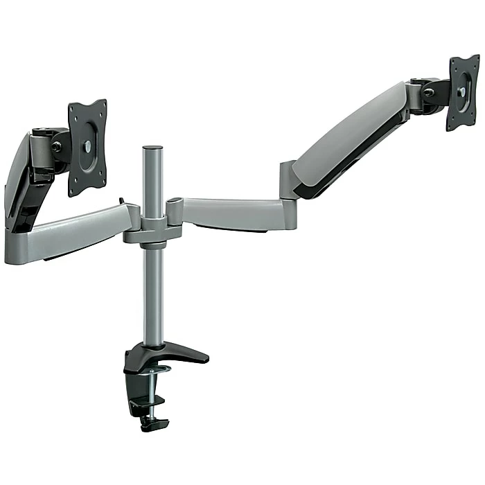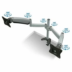 Mount-It! Height Adjustable Full-Motion Articulating Desk Mount integrates fashion with function, delivering ergonomic performance with style. Mounting two monitors side by side, over the desk will improve your productivity by preventing the need to switch screens for different applications. It will also clear up space on the desktop for your keyboard, laptop or other items. Increase viewing comfort-help reduce eye, back and neck strain. Swift and easy movements and adjustments. The spring arm tension can be adjusted to suit the weight of the monitors, allowing fingertip height adjustment. Clean look with minimal hardware visible from underside of work surface; Neat and efficient cable management; Maximum productivity and supreme ergonomic comfort; Easy installation and dis-installation. The arms are designed with cable management to provide clean installation. The monitor mount is ideal for classrooms, offices, homes, public area, industrial settings, production line and many more. This LCD desktop mount renders maneuverability, flexibility and a chic look that is sure to flatter your monitor, increasing viewing comfort-help reduce eye, back and neck strain. Features – Weight capacity: 19.8 lbs. for each monitor – Tilt: up 90 degrees to down 40 degrees – Swivel: 180 degrees at two joints and 360 degrees at one joint – Rotate: 360 degree – Spring Arm Height adjustable up to 13.5 inches – Pole Height adjustable up to 13.5 inches – Integrated cable management system – Monitor can be installed either in portrait or landscape shape – Fully adjustable arms – VESA Standard: VESA 75 (hole pattern: 75 x 75 mm), VESA 100 (hole pattern: 100 x 100 mm)
