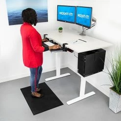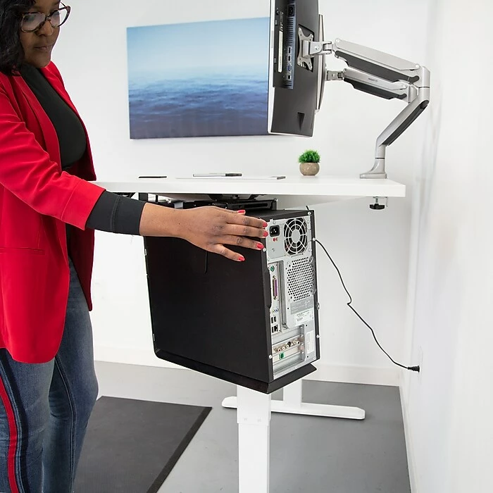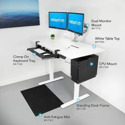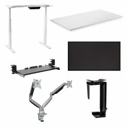 Refresh your workspace with the Executive Pro standing desk bundle, featuring our electric standing desk frame with LED control panel and solid white tabletop. This paired with our dual monitor mount, anti-fatigue mat, clamp on keyboard tray and under desk CPU mount is sure to energize your workspace as you focus on more movement throughout the day for a healthier way to work. This product bundle was created to improve your workspace efficiency, while helping to improve your overall health by making the transition from sitting to standing easier and more comfortable.Electric standing desk frame makes the transition from sitting to standing easier throughout the day. Features an easy to clean nut brown finish tabletop and an LED digital touchscreen controller with programmable height settings and a timer function.It is important to pair your height adjustable standing workstation with a soft anti-fatigue mat, designed to eliminate or reduce pain while standing for long periods of time.Dual monitor mount raises your monitors to eye level, allowing you to maintain a healthier posture and clears desk space for a cleaner, more organized workspace.Easily attach the clamp on keyboard tray, with no drilling required, to place your hands at an appropriate height for a healthier way to work. Steel ball bearings provide a smooth glide to push the tray underneath the tabletop to save space when not in use.Free up even more space with the under desk swivel CPU mount. This tower mount attaches to the bottom of the tabletop and features a swivel motion to create easier access to your CPU’s rear cables and ports.