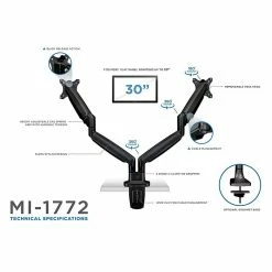 MI-1772 is one of our premium desk mounts that merges functionality with aestatics. Increase viewing comfort-help reduce eye, back and neck strain. Swift and easy movements and adjustments. The spring arm tension can be adjusted to suit the weight of the monitors, allowing fingertip height adjustment. Dual side-by-side monitor arm adjusts effortlessly for easy use. Full motion arms extend and retract, tilt, swivel and adjust in height. You can also rotate the monitors independently to switch between landscape and portrait modes. By elevating your monitors above your desk, increase desktop space and get ergonomic positioning of your screens fore reduced strain and better sitting posture.