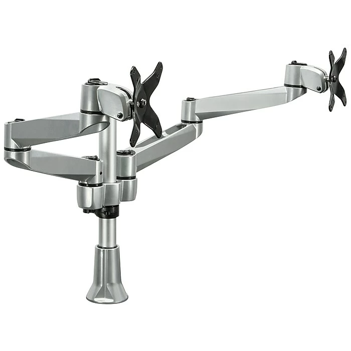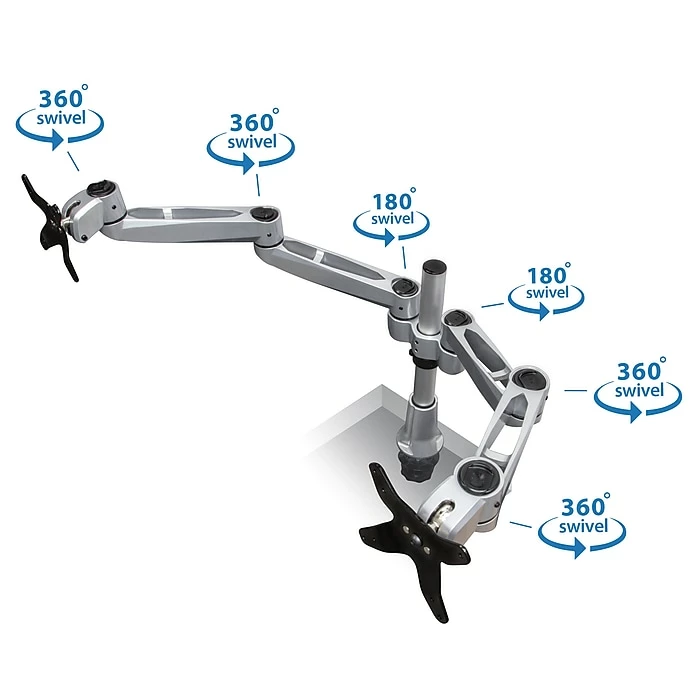 MI-43111 dual monitor mount features two articulating arms to create a more customized workspace. Each arm can swivel independently for a customized setup. From height adjustment, to monitor tilt, swivel and rotation, this monitor desk mount is designed to maximize the user’s efficiency and comfort. Boost productivity and enhance workflow with double the screen space, while improving posture and clearing up more desk space by elevating the monitors. This premium dual monitor mount is fully TAA (Trade Agreements Act) compliant and is suited for purchase by the U.S. government. It is a modular monitor mount, meaning it is fully customizable with the ability to add or remove monitor-mounting arms, which allows an organization to develop cost-effective, tailored solutions for their employees’ needs. The grommet base easily attaches to any desktop hole on desks measuring up to 5” thick, making it an easy addition to any workspace. The heavy-duty aluminum construction is designed to withstand heavy-use and to withstand the test of time. Each arm can carry monitors measuring in size up to 32” and up to 19.8lbs per mounting arm.