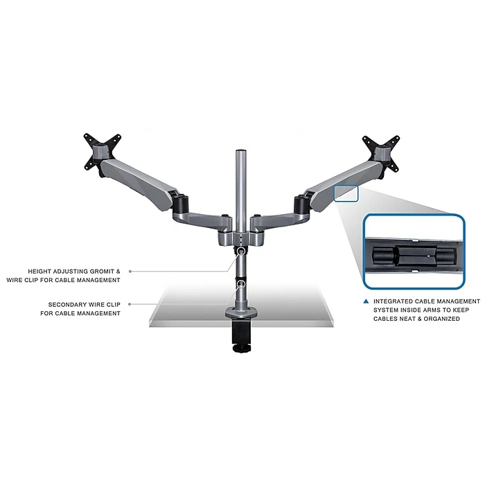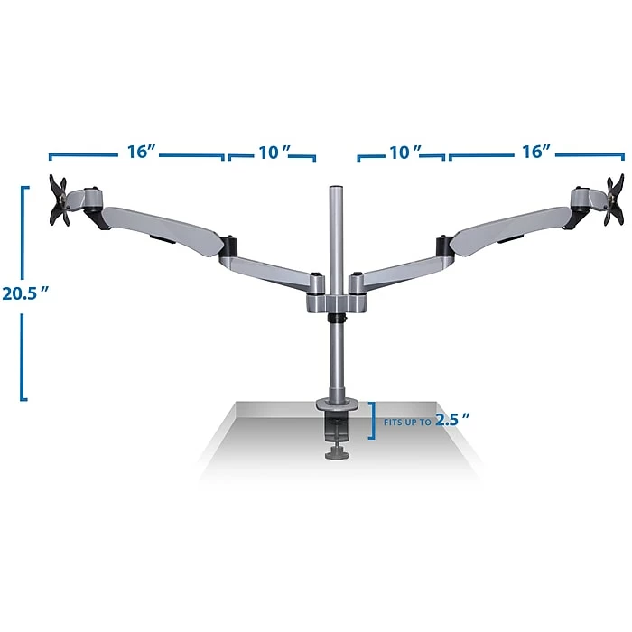 MI-45116 dual monitor mount features two gas spring arms for smooth full motion monitor adjustments. From height adjustment, to monitor tilt, swivel and rotation, this monitor desk mount is designed to maximize the user’s efficiency and comfort. Boost productivity and enhance workflow with double the screen space, while improving posture and clearing up more desk space by elevating the monitors. This premium dual monitor mount is fully TAA (Trade Agreements Act) compliant and is suited for purchase by the U.S. government. It is a modular monitor mount, meaning it is fully customizable with the ability to add or remove monitor-mounting arms, which allows an organization to develop cost-effective, tailored solutions for their employees’ needs. The c-clamp base easily attaches to any desk measuring.79” to 2.36” thick, making it an easy addition to any workspace. Each arm can carry monitors measuring in size up to 32” and up to 19.8lbs per mounting arm.
