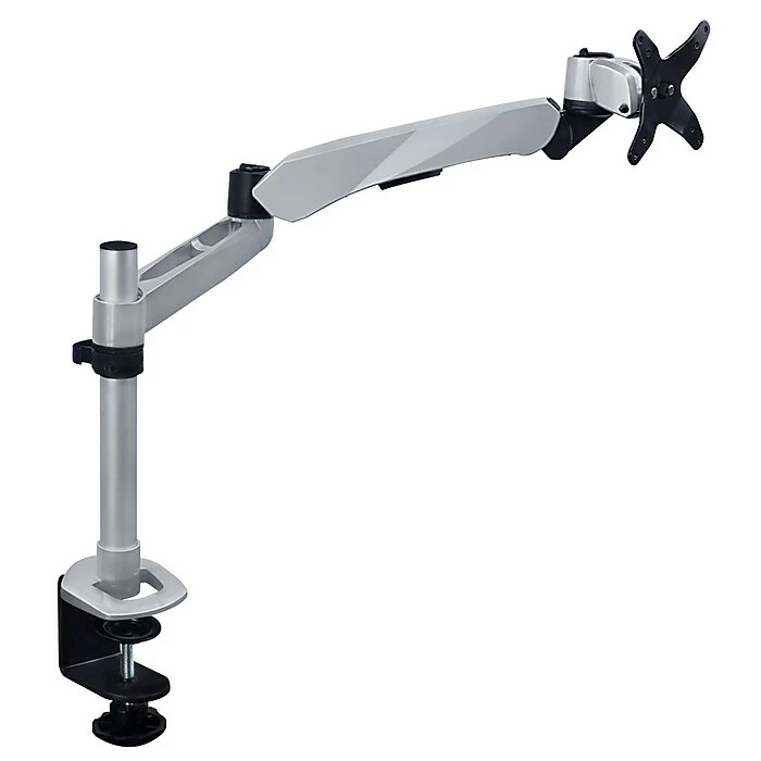MI-35116 single monitor mount features a gas spring arm for smooth full motion monitor adjustments. From height adjustment, to monitor tilt, swivel and rotation, this monitor desk mount is designed to save desk space while improving posture by raising the monitor to eye level. This premium single monitor mount is fully TAA (Trade Agreements Act) compliant and is suited for purchase by the U.S. government. It is a modular monitor mount, meaning it is fully customizable with the ability to add or remove monitor-mounting arms, which allows an organization to develop cost-effective, tailored solutions for their employees’ needs. The c-clamp base easily attaches to any desk up to 3” thick, making it an easy addition to any workspace. Fits monitors up to 32” with a weight capacity of 19.8lbs.
