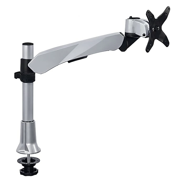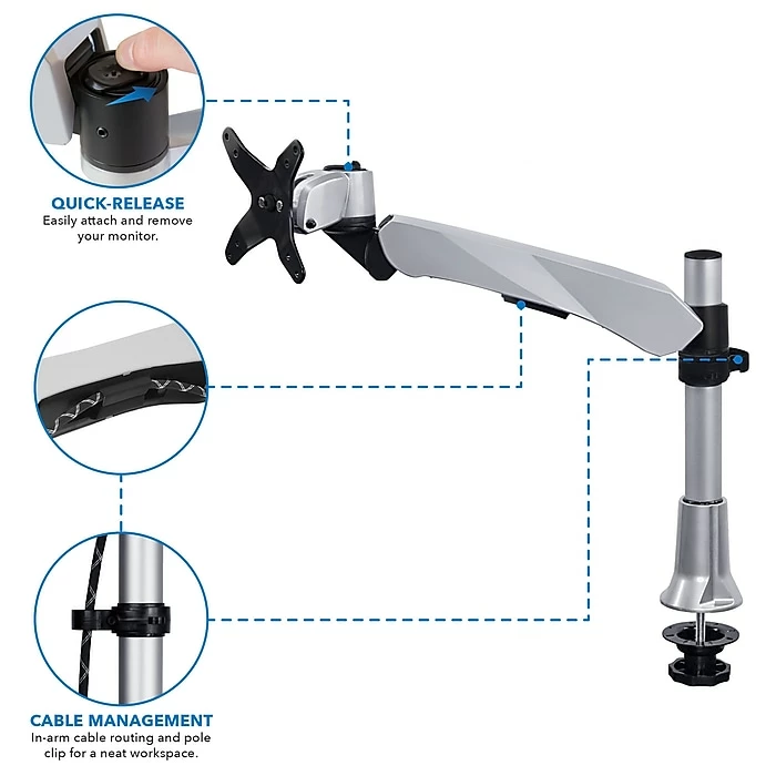 MI-34111 Single monitor desk mount features a gas spring arm for smooth full motion monitor adjustments. This mount has a shorter arm, ideal for smaller desk spaces, but can easily be customized with its modular design. From height adjustment, to monitor tilt, swivel and rotation, this monitor desk mount is designed to position your monitor perfectly for a healthier, more comfortable way to work. Save desk space while improving posture by elevating your monitor off of the desk to eye level. This premium single monitor mount is fully TAA (Trade Agreements Act) compliant and is suited for purchase by the U.S. government. It is a modular monitor mount, meaning it is fully customizable with the ability to add or remove monitor-mounting arms, which allows an organization to develop cost-effective, tailored solutions for their employees’ needs. The grommet base easily attaches to any desk up to 3” thick, making it an easy addition to any workspace. Fits monitors up to 32” with a weight capacity of 19.8lbs.