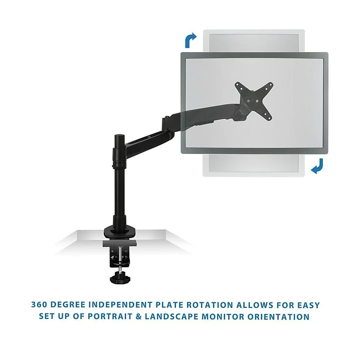 MI-35111B single monitor mount features a gas spring arm for smooth full motion monitor adjustments. From height adjustment, to monitor tilt, swivel and rotation, this monitor desk mount is designed to position your monitor perfectly for a healthier, more comfortable way to work. Save desk space while improving posture by elevating your monitor off of the desk to eye level. This premium single monitor mount is fully TAA (Trade Agreements Act) compliant and is suited for purchase by the U.S. government. It is a modular monitor mount, meaning it is fully customizable with the ability to add or remove monitor-mounting arms, which allows an organization to develop cost-effective, tailored solutions for their employees’ needs. The grommet base easily attaches to any desk up to 3” thick, making it an easy addition to any workspace. Fits monitor’s up to 32” and can carry up to 19.8lbs.