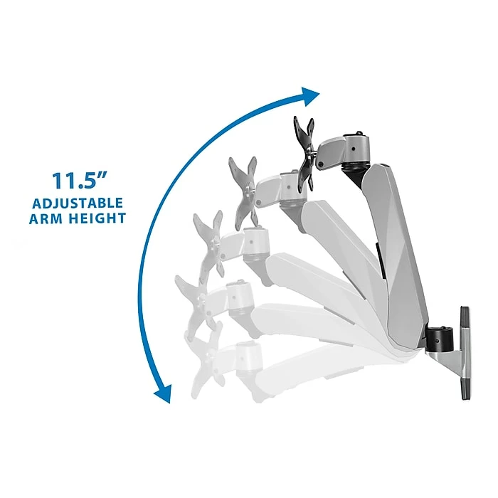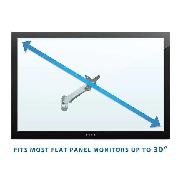 MI-34114 Single monitor wall mount features an articulating gas spring arm capable of smooth full motion movements, including height adjustment, tilt, swivel and rotation to fully adapt to your working preferences. This wall mount is designed to desk and office save space while improving posture by raising the monitor to eye level in any type of environment. This premium monitor wall mount is fully TAA (Trade Agreements Act) compliant and is suited for purchase by the U.S. government. It is a modular monitor mount, meaning it is fully customizable with the ability to add, remove, shorten or lengthen the monitor-mounting arm, which allows an organization to develop cost-effective, tailored solutions for their employees’ needs. The easy to install wall mount requires only a single stud for installation making it a quick addition to any workspace. The arm features a cable management port to hide and organize cables for a clean look. It can carry monitors measuring in size up to 32” and boasts a 20lb load capacity.