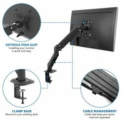 The Mount-It! MI-5761 single-monitor desk mount stand integrates fashion with function, delivering ergonomic performance with style. The spring arm tension can be adjusted to suit the weight of the monitors, allowing fingertip height adjustment. The arm is designed with cable management to provide clean installation. The monitor mount is ideal for classrooms, offices, homes, public areas, industrial settings, production lines, and many more. This LCD desktop mount renders maneuverability, flexibility, and a chic look that is sure to flatter your monitor, increasing viewing comfort.