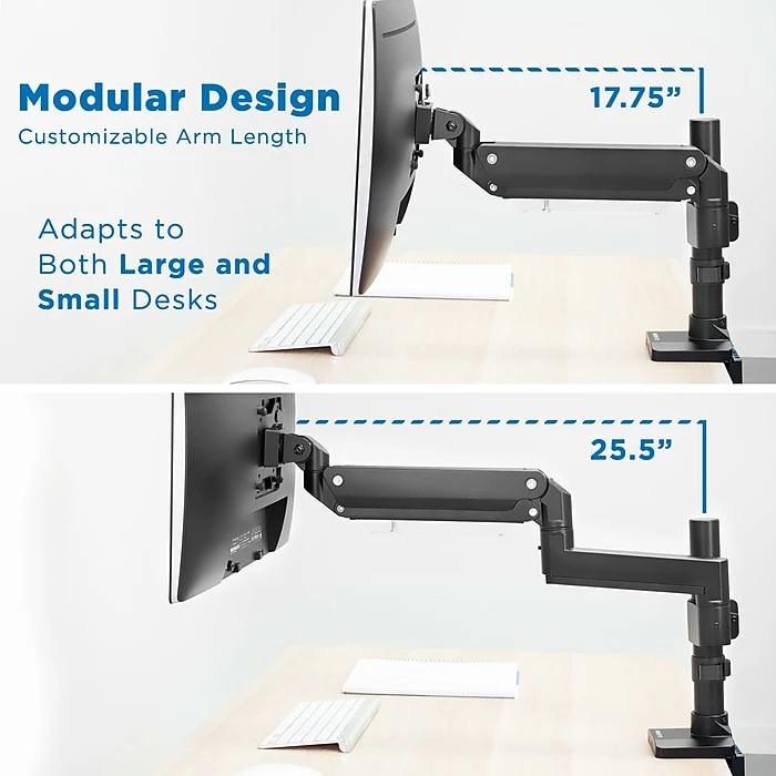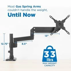 Raise your monitor to an ergonomic position and free up desk space with this single monitor mount. The heavy-duty gas spring arm holds up to 33 lbs. and features fluid, full-motion movements to achieve the perfect monitor placement. The mount includes both clamp and grommet installation options to fit a variety of desks. Tilt and swivel functionality offers multiple monitor angles for comfortable reading, and integrated cable management keeps your cords off your desk.
