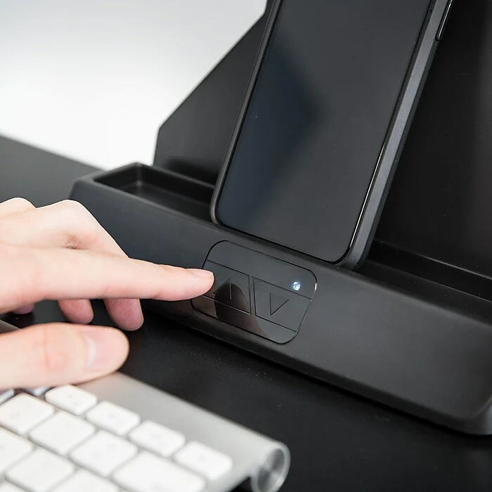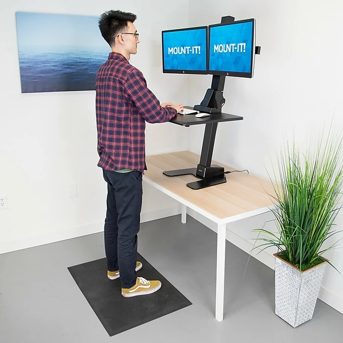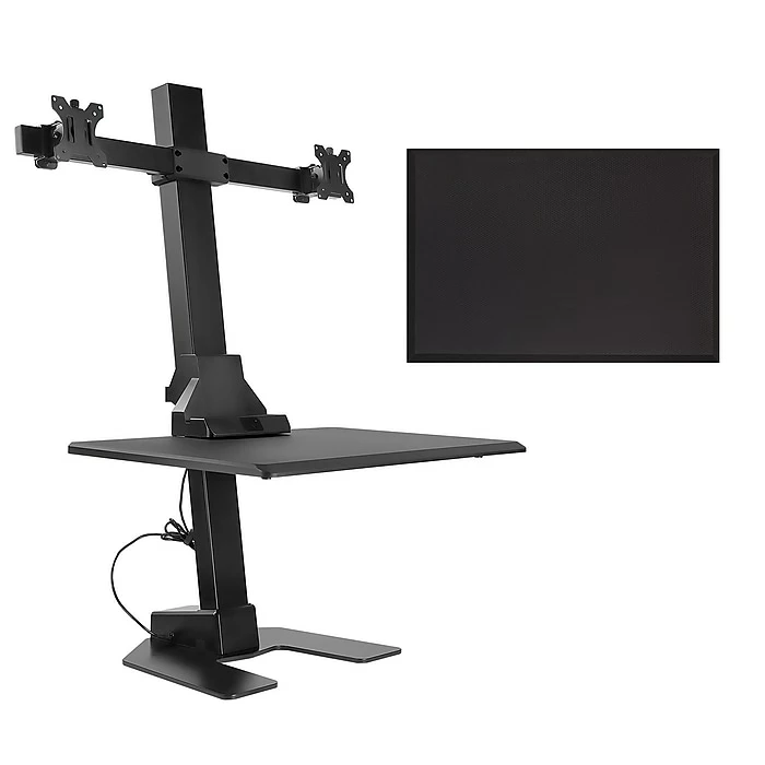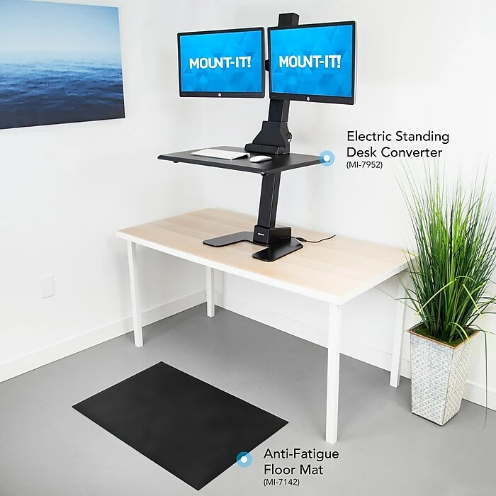 Redefine your workspace with the PowerUp ergonomic workstation bundle. This electric sit stand workstation with a built-in dual monitor mount, tabletop and integrated slot for a phone or tablet can be placed on any desk to create a healthier and more active workspace. The motorized lift is height adjustable from 27.6” to 47.2”, allowing for easy customization throughout the day. Stay active throughout your work day by maintaining a healthy balance of sitting and standing. No sit stand workstation is complete without a comfy anti-fatigue mat. Utilize this cushy mat while standing at your desk for prolonged periods to reduce strain on your ankles, knees and back. The soft padding is designed so you can stand for longer periods without feeling the pain.This height adjustable electric standing desk converter features a built-in dual monitor mount, creating the ultimate workspace for anyone looking to improve their posture and overall health in the workplace.Our anti-fatigue mat is a necessity with any standing desk. The soft cushy floor mat is designed to allow you to stand longer at your standing desk without the pain associated with prolonged periods of standing.