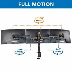 Heavy duty stand and pole design makes this three monitor mount sturdy. Economical and dependable, mechanical monitor arms allow several height options for placing your monitor in the best ergonomic position, while offering more desktop space. The two, outside swing arms that support the monitors can be adjusted on the vertical pole for the best height placement.