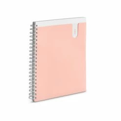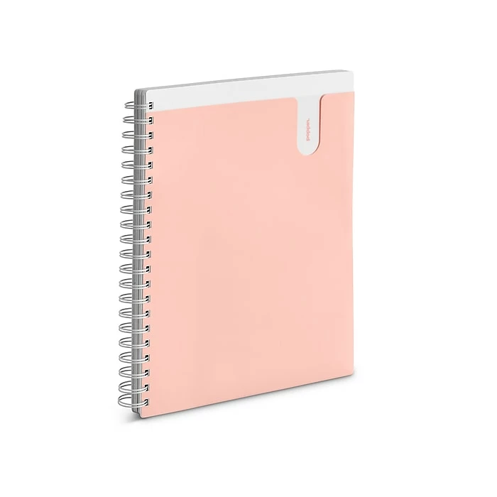 - Three-subject pocket notebook with heavy-duty round white metal spiral features a translucent front cover pocket, two dividers, and 120 ruled sheets with microperforated pages